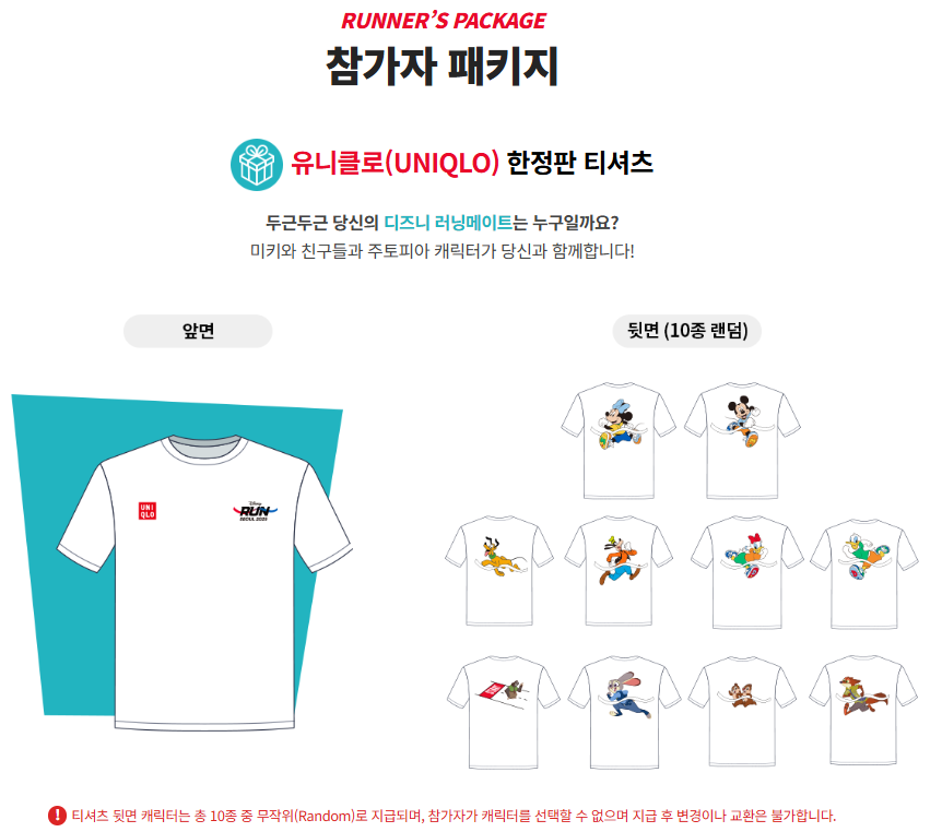 - 티셔츠: 미키·미니·주디 등 한정판 캐릭터 디자인 (랜덤 배정, 교환 불가)
