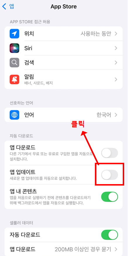 - iOS: 설정 → 앱 → 앱스토어 → 자동다운로드 항목 → 앱 업데이트 해제