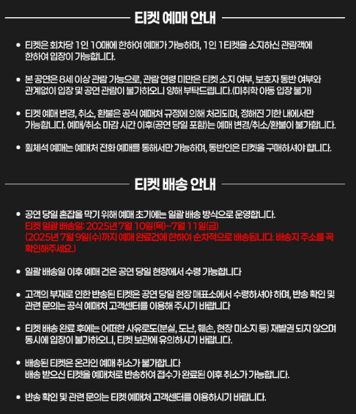 - 공연 중 사진·영상 촬영 및 SNS 생중계는 저작권·초상권 침해로 금지되며 적발 시 퇴장 대상입니다.