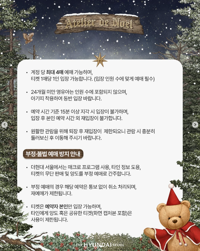 (굿즈 구매·교환·환불은 외부 ‘크리스마스 공방’ 매장 앞에서 진행됩니다.) - 24개월 미만 유아의 입장: 인원 수에 포함되지 않으며,